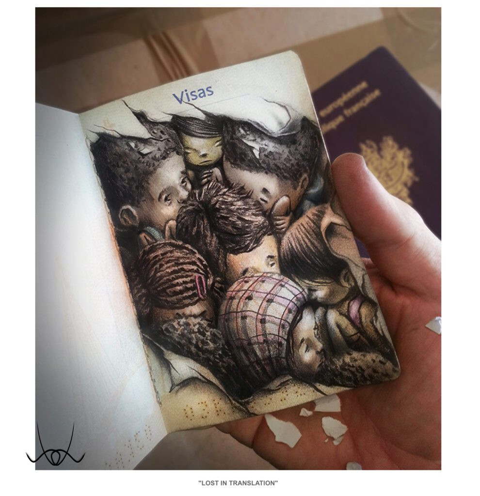Vizuális véleményt alkotott a menekültkrízis legártatlanabb áldozatairól. Az útlevelekbe rajzolt, realisztikus és street art stílusban készült kollekciójában felhívja a figyelmet a háborúk gyötörte világok gyermekáldozataira. Harc a beteljesületlen reménnyel egy biztonságosabb világért.