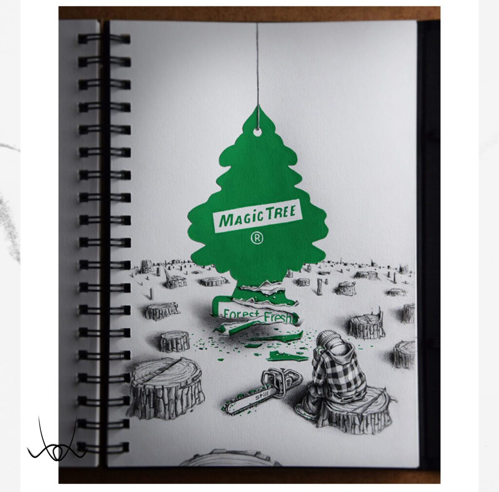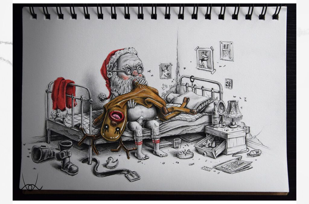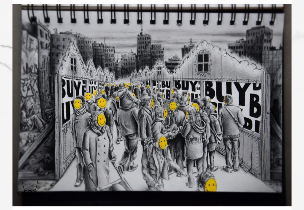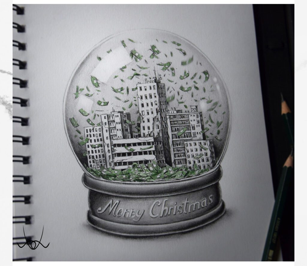 Rajzfüzeteinek lapjain keresztül tükröt állít a kapitalizmus karácsonyának, amelyben elbeszéli az általános „áldott” ünnepi időszakot, amit mi, emberek, a társadalom részeként megalkottunk. Money Christmas. A hibát önmagunkban hordjuk, másra mutogatni értelmetlen.